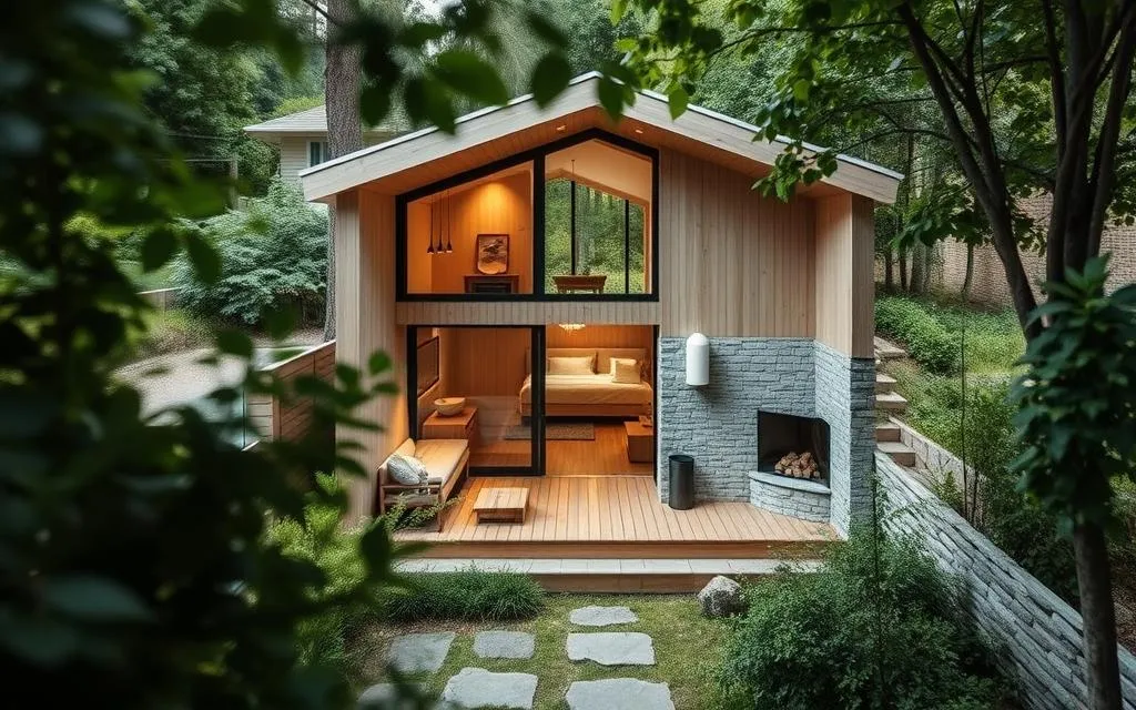 Materiais naturais e sustentáveis, como madeira e pedras, são perfeitos para casas pequenas modernas. Eles enriquecem a estética e são alinhados com os princípios do minimalismo.