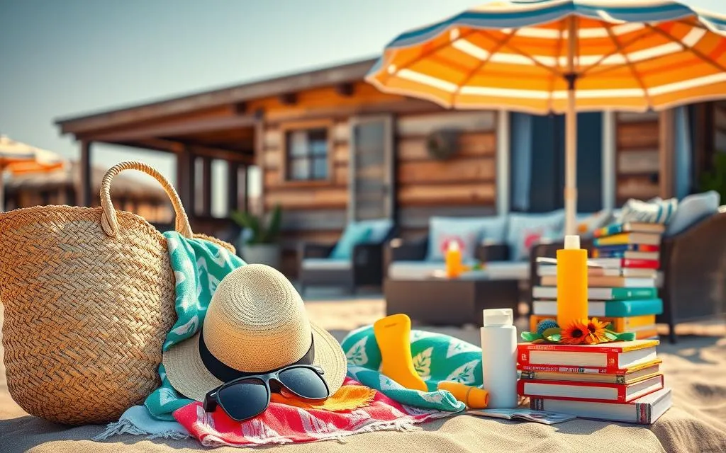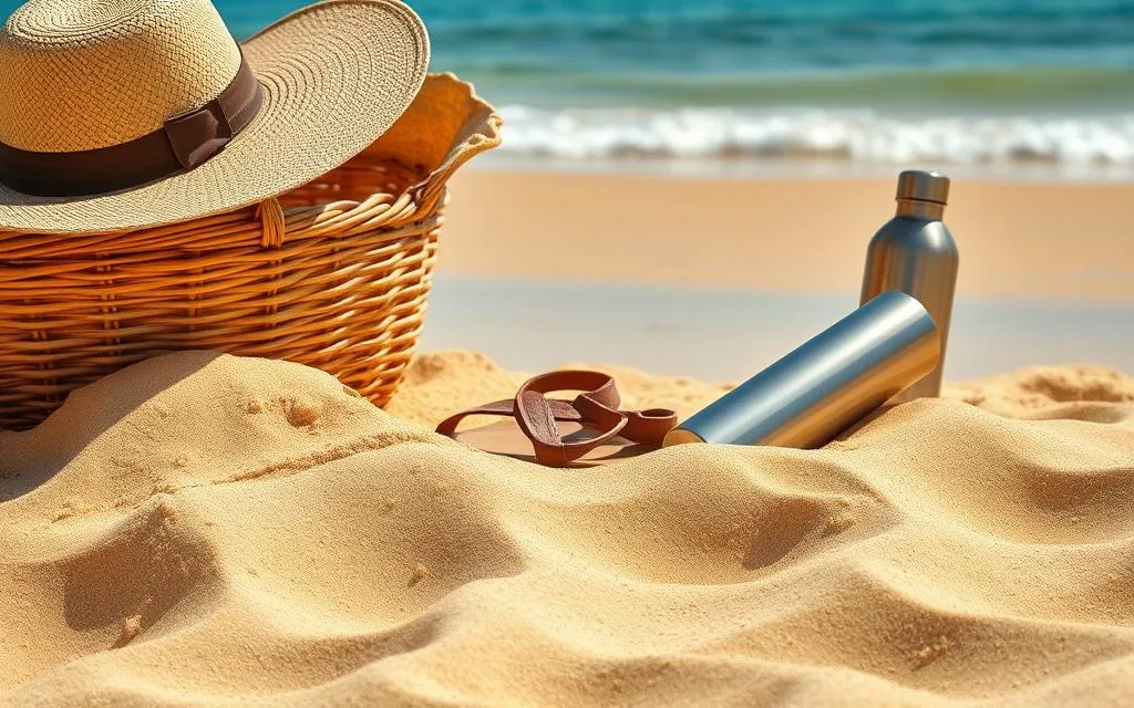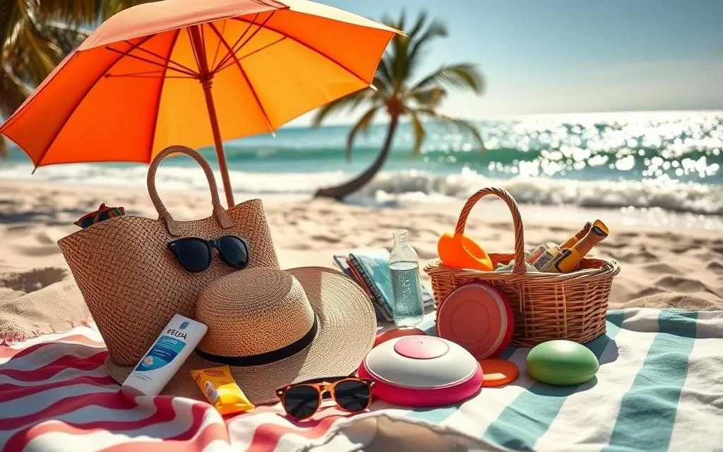 Inclua toalhas, protetor solar, chapéus, óculos de sol, bebidas, snacks e acessórios para entretenimento. Jogos ou livros são ótimos.