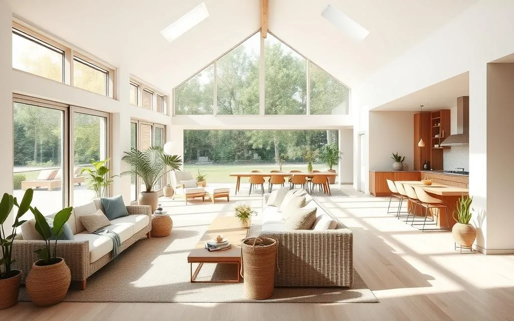 A luz natural é essencial para um ambiente saudável. Janelas grandes e claraboias maximizam a luz do dia.Isso reduz a necessidade de eletricidade. E melhora o bem-estar emocional. Resultando em um espaço mais acolhedor.