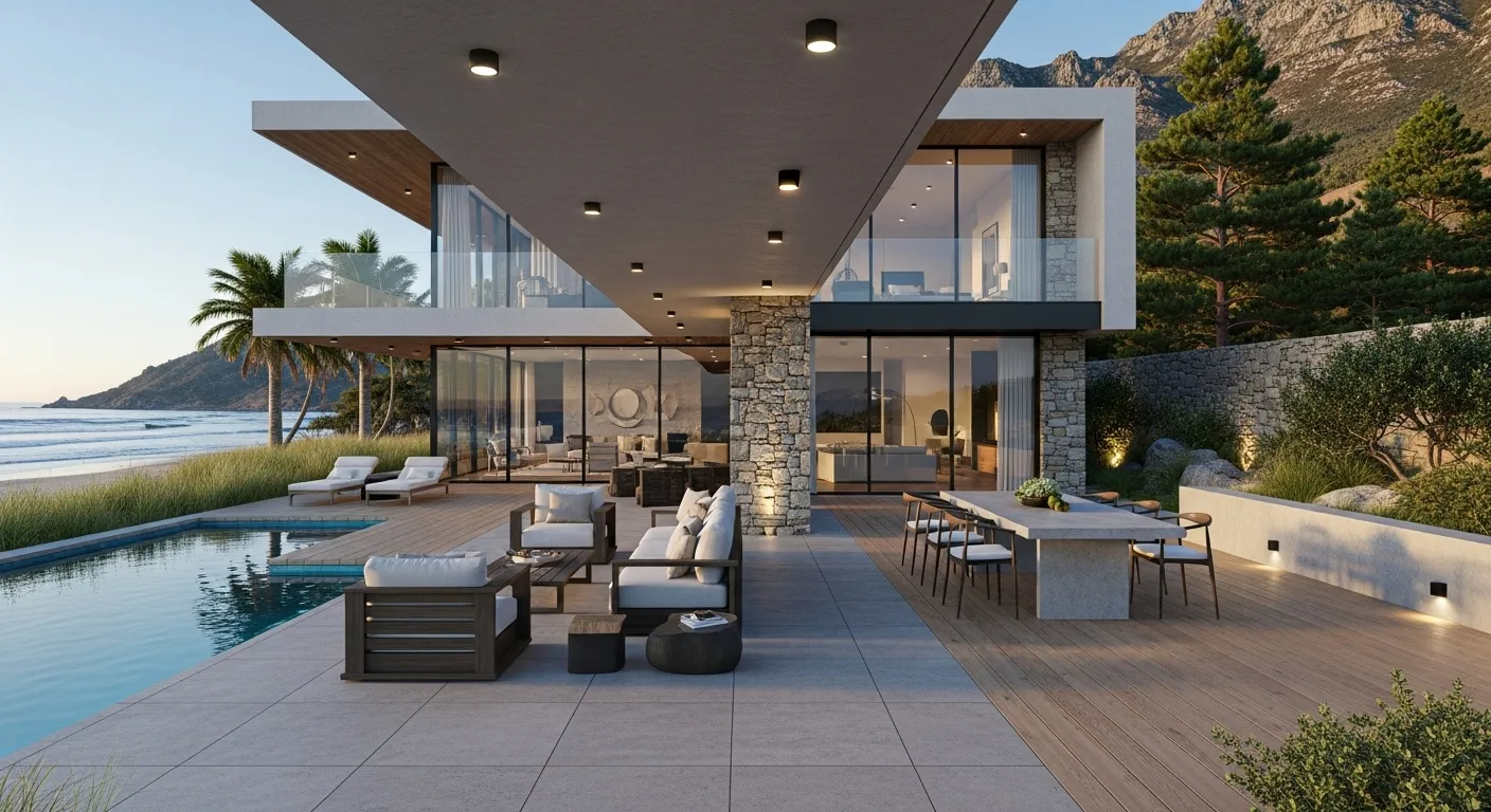 Com o uso de madeiras naturais e acabamentos que imitam a natureza, essas casas trazem um charme rural à beira-mar.