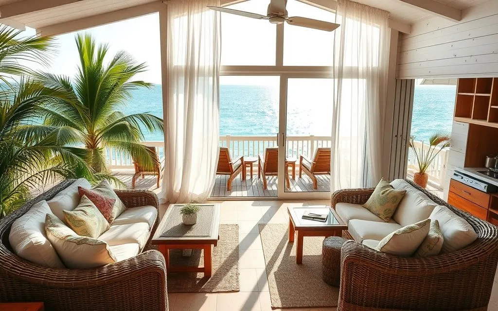 A decoração é essencial para tornar casas de praia compactas acolhedoras. Usar cores terrosas e elementos naturais melhora muito o espaço. Isso cria um ambiente que faz bem ao corpo e à mente.