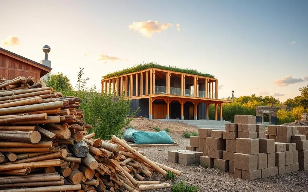 Na construção de casas modernas, escolher materiais sustentáveis é essencial. Usar materiais recicláveis ajuda a reduzir o desperdício. Isso melhora o ambiente. Vejamos alguns materiais importantes para construção ecológica.