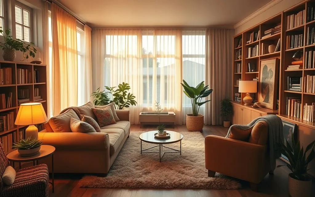 A iluminação também é essencial. Luzes quentes e difusas criam um clima mais íntimo. Isso ajuda a fazer sua casa sentir-se mais acolhedora.