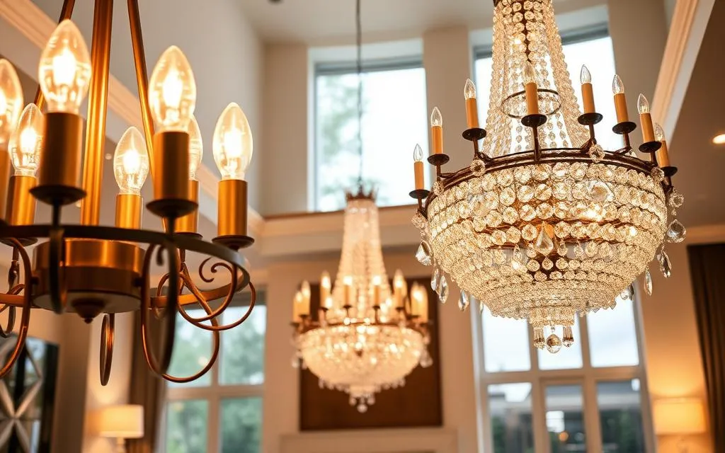 A escolha dos materiais para lustres é crucial. Ela garante a beleza e a durabilidade do item. Lustres de vidro ou metal são mais fáceis de limpar que os de tecido ou detalhes delicados.