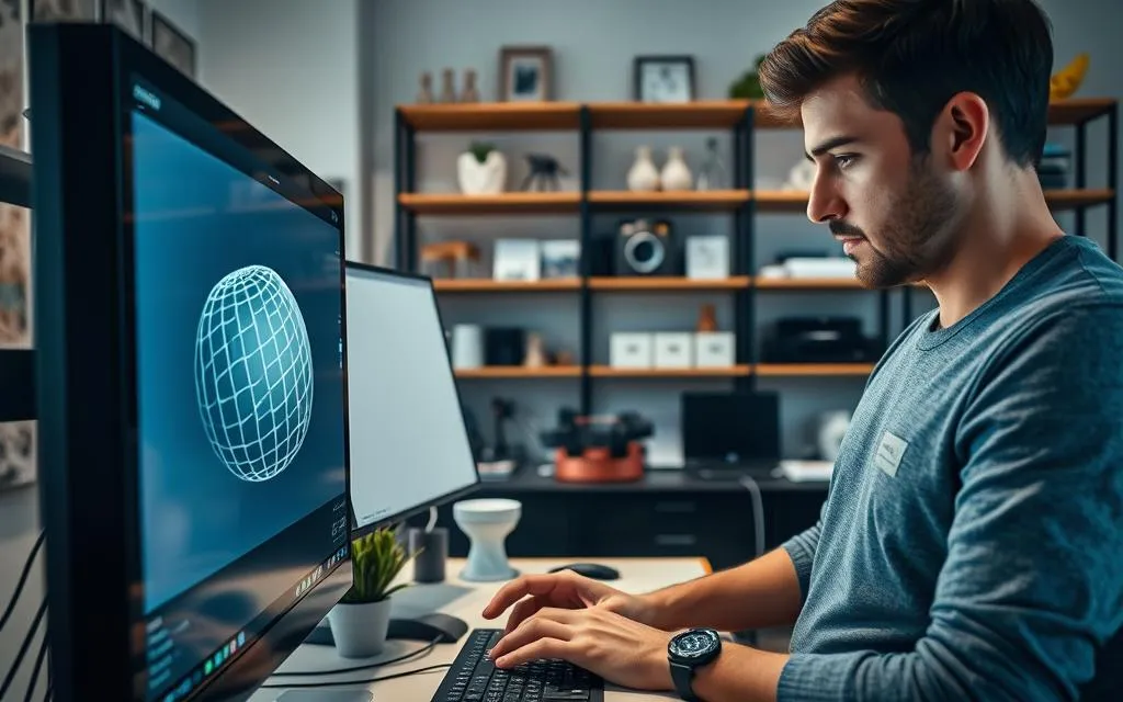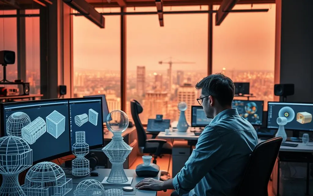 Primeiro, o designer usa softwares para criar formas básicas. Essas formas, chamadas de geometrias, são o começo dos modelos digitais. Depois, texturas são aplicadas para dar vida e realismo aos objetos. Cada detalhe é pensado com cuidado para que o projeto final seja fiel.