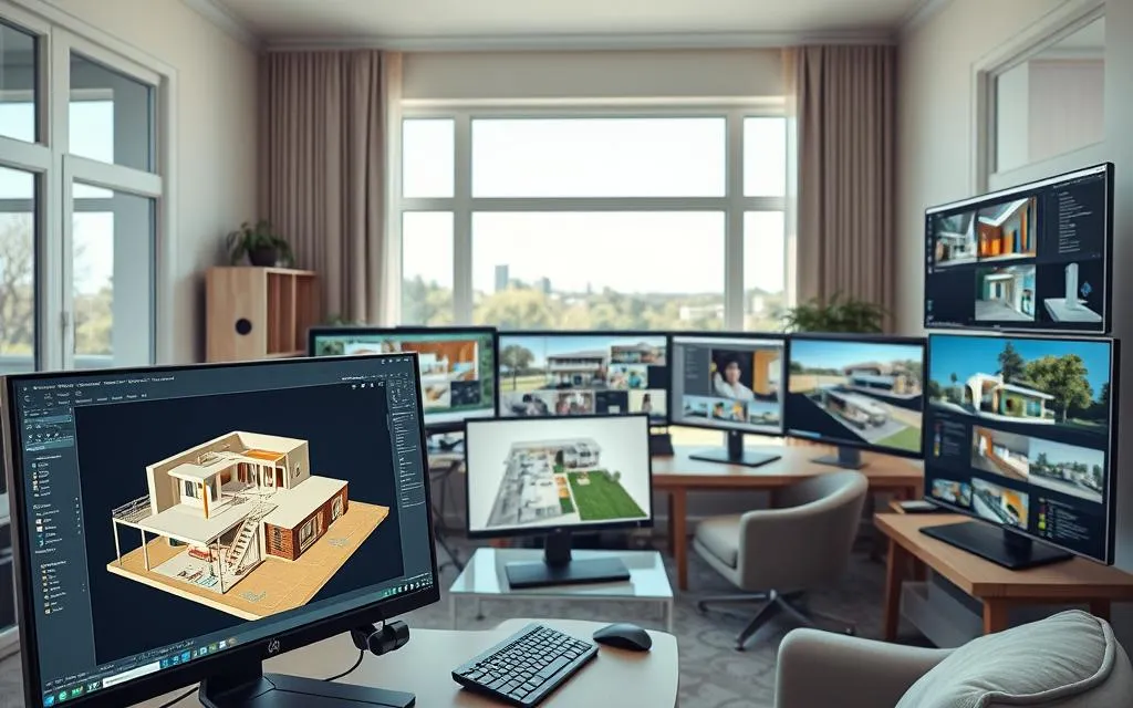 Softwares como Autodesk, Blender, SketchUp e Archicad são essenciais. Eles têm funções específicas para diferentes projetos.