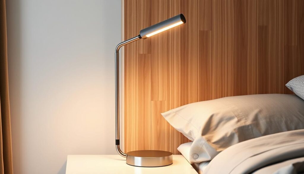 Escolha uma luz de leitura que tenha intensidade ajustável e cor quente. Isso ajuda a não perturbar o sono. Além disso, pense no design e onde a luz será colocada para evitar reflexos.