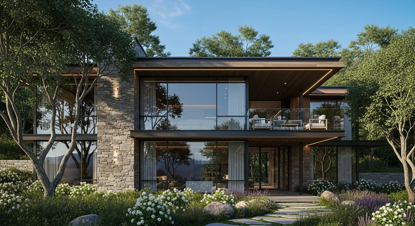 - Casa Minimalista: Linhas retas e superfícies lisas, com janelas emolduradas em preto que destacam o design simplista.