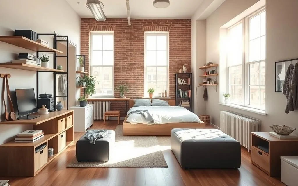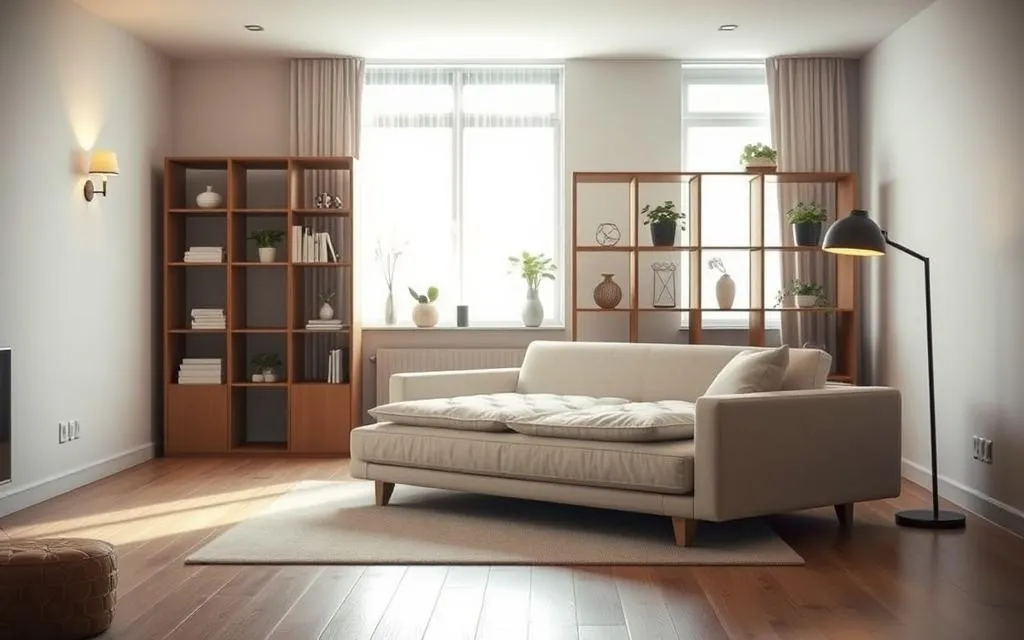 Móveis Multifuncionais são ótimos para espaços pequenos. Eles são versáteis e não perdem em design. Pense em sofás-camas, mesas dobráveis e estantes que dividem o espaço.