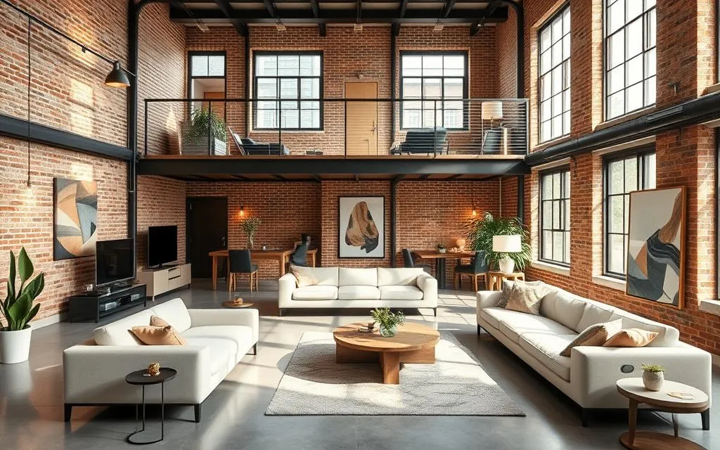 Os lofts modernos são perfeitos para quem quer um estilo de vida atual. Eles têm uma planta aberta, o que cria espaços grandes e liberdade. A luz natural entra livremente, iluminando tudo.