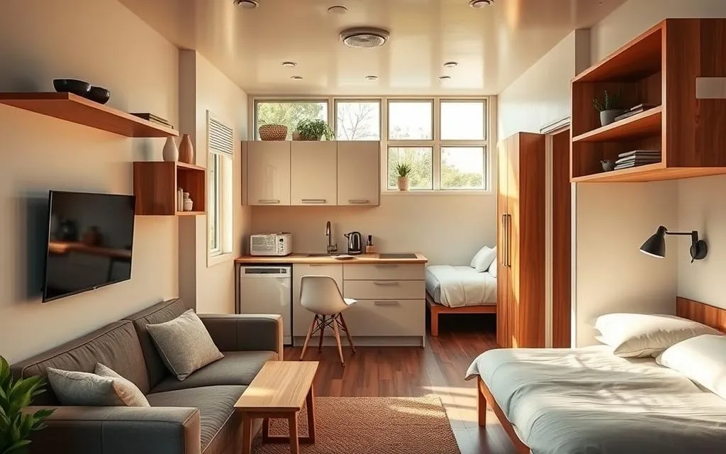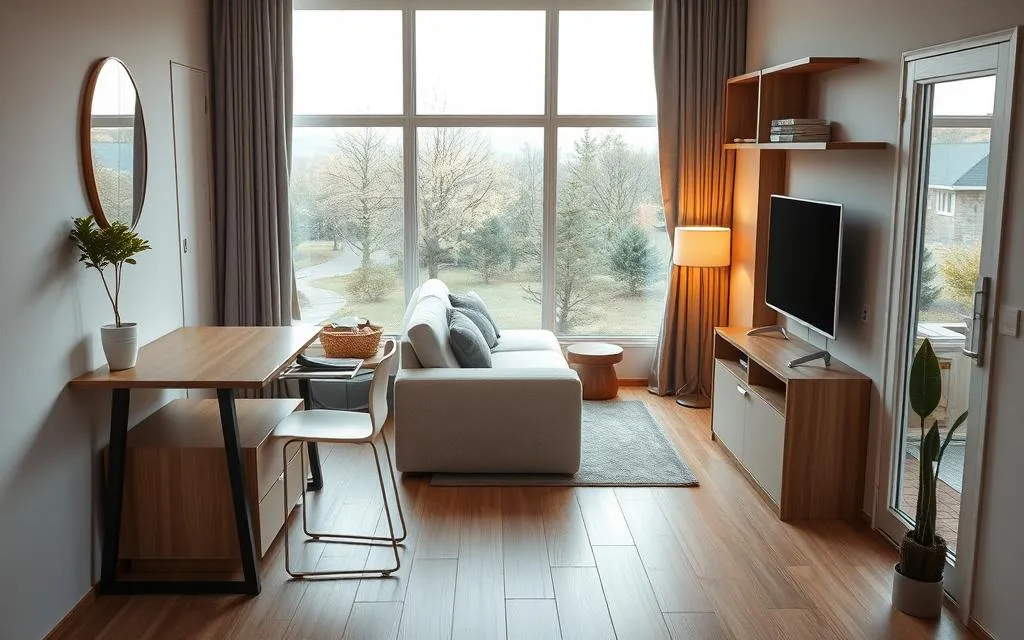 Em casas pequenas, a eficiência é o que importa. Móveis que fazem mais de uma coisa, como sofás-camas, economizam espaço. Armários embutidos mantêm a organização sem perder a beleza.