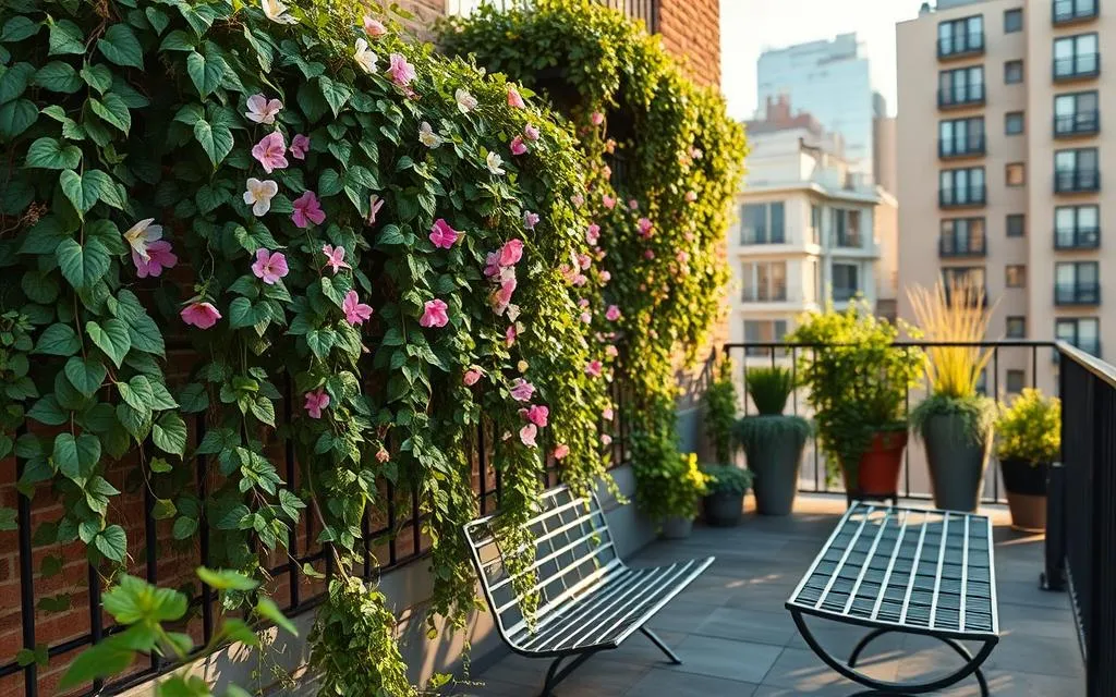 Use móveis compactos, como mesas de bistrô. Ideias para jardins verticais são ótimas. Elas aproveitam o espaço vertical para plantas, flores e ervas.