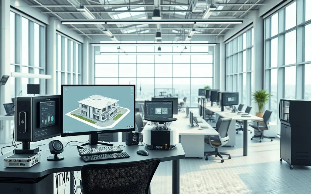 As tecnologias de modelagem 3D são essenciais no design e na construção. Ferramentas como software CAD, como AutoCAD e Revit, são muito usadas. Elas ajudam a criar modelos digitais detalhados dos projetos.