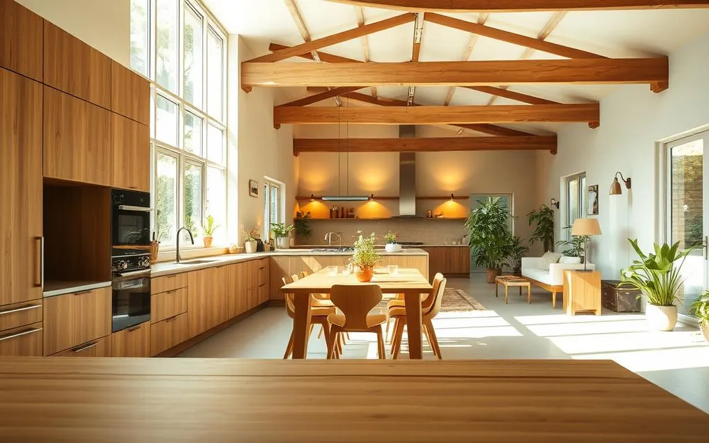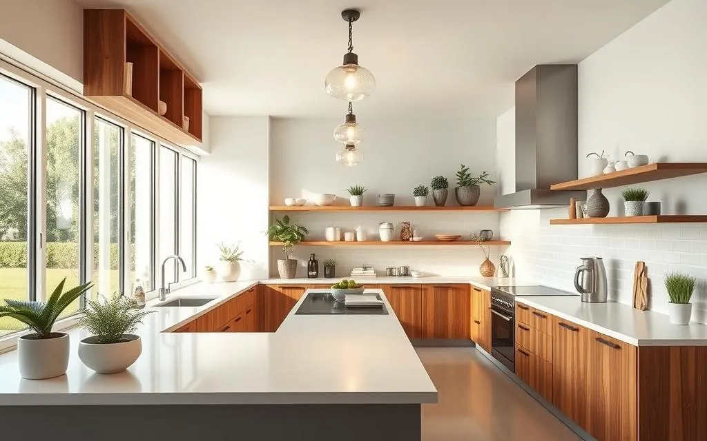 Escolha materiais sustentáveis, como madeira de reflorestamento. Também use soluções que economizem energia. Isso torna a cozinha mais verde.